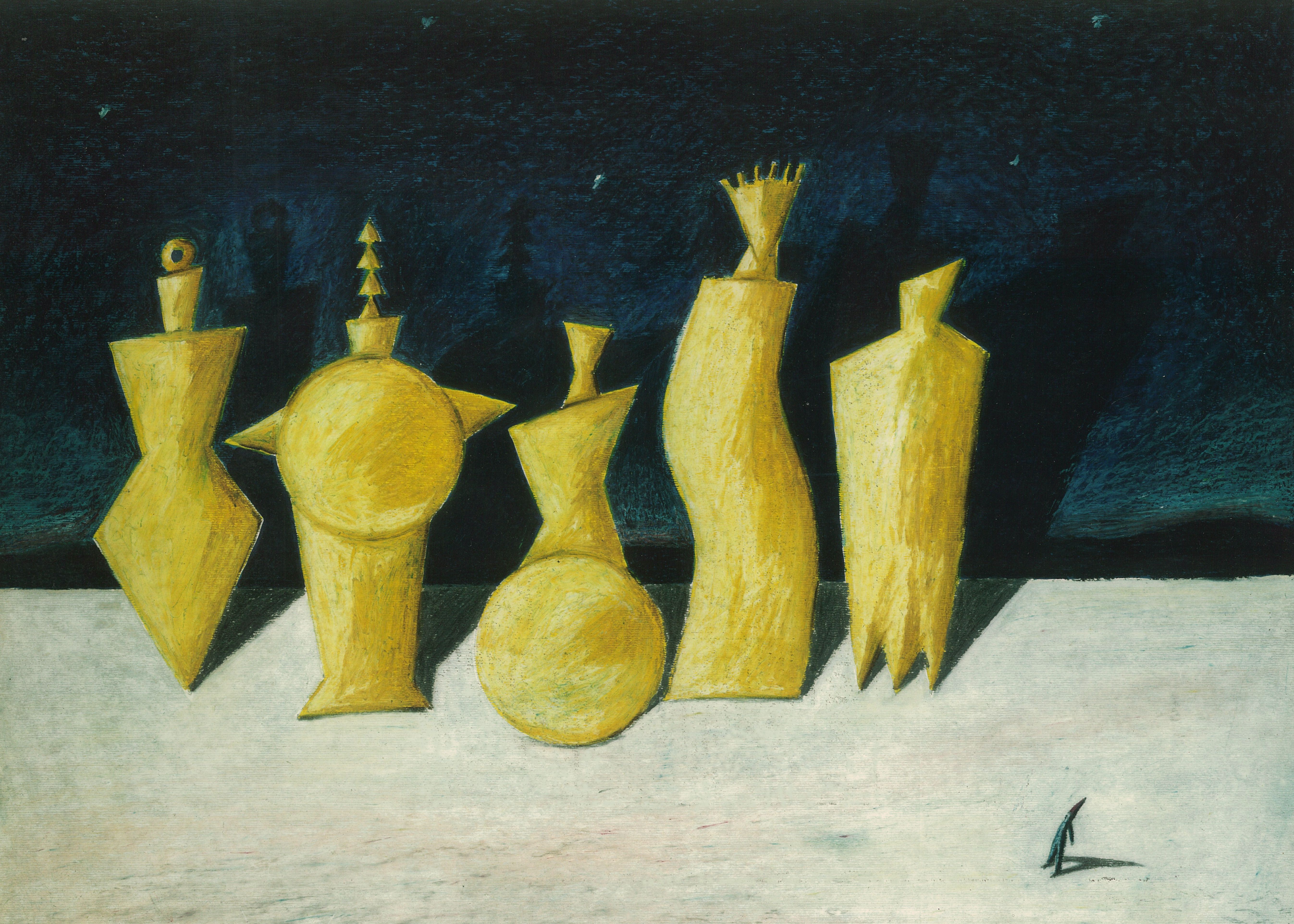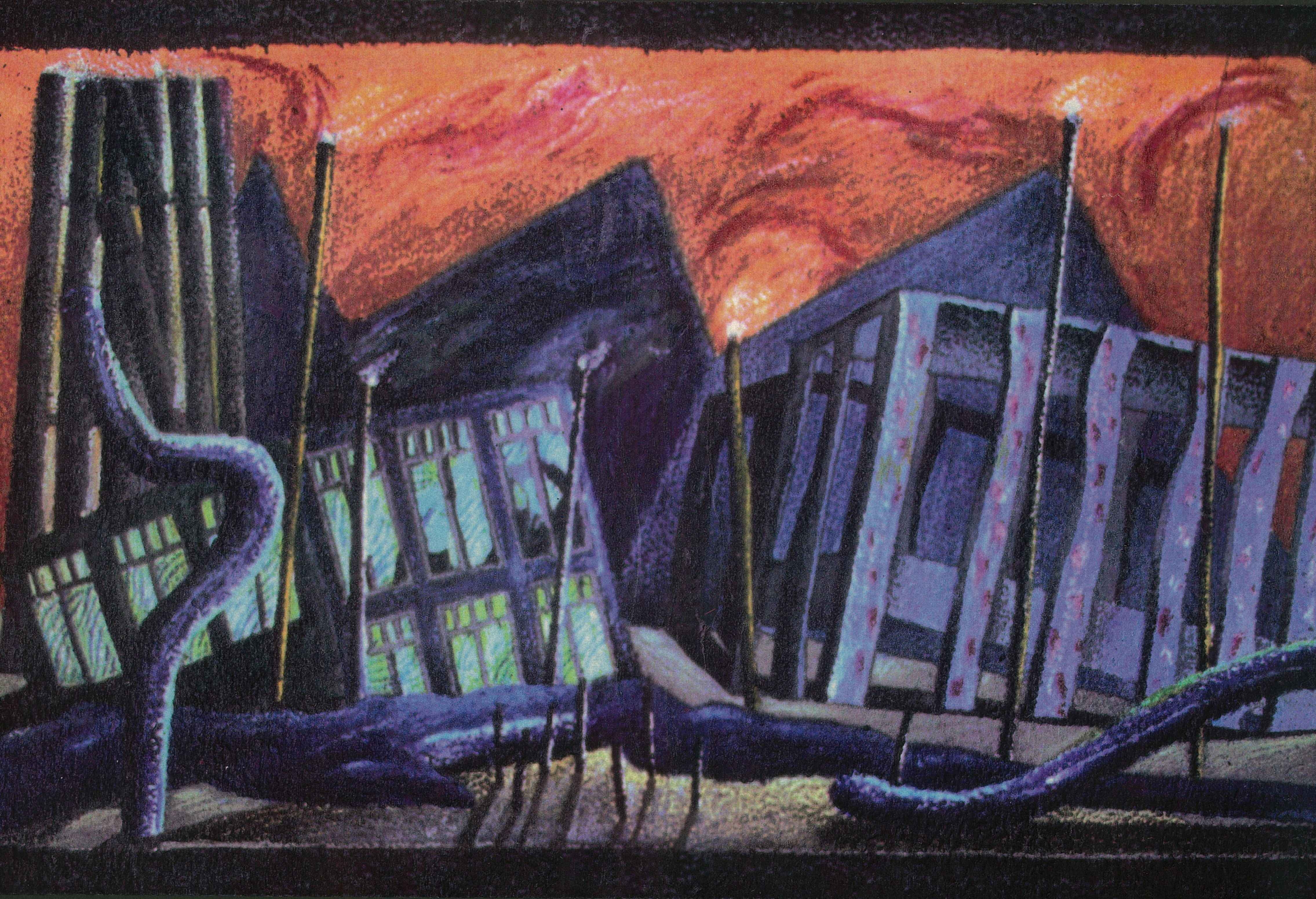 C’è un diretto riferimento all’espressionismo tedesco di Nolde e Kirchner in questo paesaggio deformato, affogato in quelle tinte cupe previste già nei bozzetti. Scarpato seguirà sin dalla fondazione la Compagnia Solari-Vanzi, che continua il proprio percorso con artisti visuali e musicisti. Tra il 1985 e il 1987crea le scenografie per Suono giallo (prodotto dal Fabbricone di Prato) e Racconti inquieti (presentato al Festival di Santarcangelo e a Narni), e scene e manifesto per Il cavaliere azzurro (Teatro La Piramide, Roma).